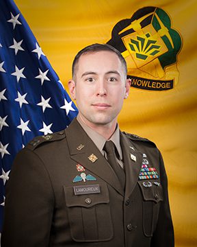 CPT Lamoureux’s awards and decorations include: The German Armed Forces Proficiency Badge, the Norwegian Foot March Badge, the Australian Jump Wings, Air Assault Badge, Airborne Parachutist Badge, Aerial Delivery Material Officer Course Badge, Expert Soldier Badge, Army Achievement Medal (1 OLC), Army Commendation Medal (1 OLC), Meritorious Service Medal, Armed Forces Service Medal, Army Service Ribbon, Global War on Terrorism Service Medal, Korea Defense Service Medal, Military Outstanding Volunteer Service Medal, National Defense Service Medal, and the Overseas Service Ribbon.